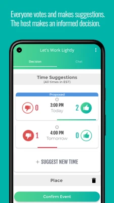Let's combines the flexibility of group texts with the efficiency of calendar events. With Let's, a host suggests a time and place, and then group members can offer new suggestions and vote. The host makes an informed decision. Everyone reaches a decision faster and with less notifications.