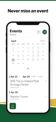 NEVER MISS AN EVENT The event section shows a list of events throughout the district. Users can add an event to their calendar to share the event with friends and family with one tap.
