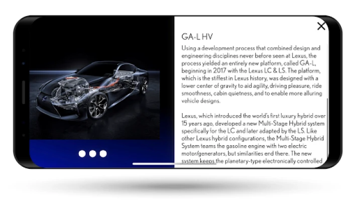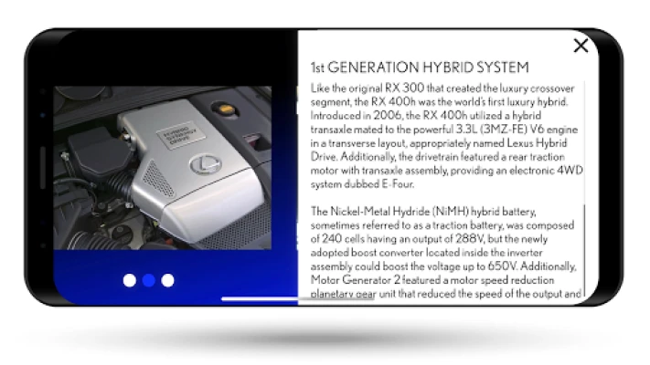 Through immersive and engaging augmented reality (AR), discover self-charging hybrid electric, plug-in hybrid electric, and battery electric vehicle technology. When visiting a Lexus dealer or at home, use the AR functions to experience the Lexus hybrid or BEV technology in action with a virtual model or on an actual vehicle using the Overlay mode.