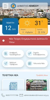 1. Problem Report Problem report can be done immediately or, if there is no available network, the user can save the report and submit it later. Furthermore, the user can watch the status of the submitted reports as they are been solved. 2. Municipality's of Limassol latest news. 3. Municipality's of Limassol latest events. 4. Points of Interest 5. Useful Numbers 6. Public Parking Spots for people with special abilities. 7. public Parking spaces with live capacity feed. 8. Immediate contact with the Municipality through phone or email.